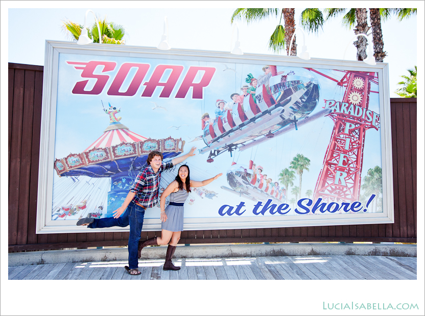 Hanna and Alex first met each other on school’s swim team.  Since then, Hanna has kept up with the sport, participated in 2010 Nautica Malibu Triathlon (finished 5th overall in her age group too!)  Her athleticism is so inspiring.  :-)  Alex has a really cool job with Disney where he gets to brainstorm new ideas for others to implement.  Henry’s jealous!  During our half-day photoshoot, we roamed both parks and had an amazing time together.  There were so many photo opportunities with all the colorful and fun backdrops that I felt once again like a kid set loose in a candy shop.  Oh boy, oh boy, oh boy (in Donald Duck’s voice), life is extra jolly when you hang out with the energetic and fun-loving Hanna and Alex!